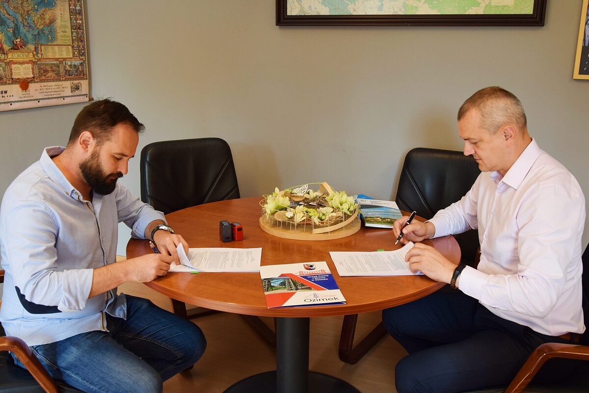 Burmistrz Ozimka Mirosław Wieszołek oraz Tomasz Pieńkowski – Członek Zarządu Lidera Konsorcjum firm - Lider: Probudowa.com Sp. z o.o. oraz Partner: IMD Paweł Wątroba – głównego wykonawcy inwestycji dnia 2 sierpnia 2021 r. podpisali umowę na zadanie pn. „Remont zabytkowego mostu w Ozimku”.