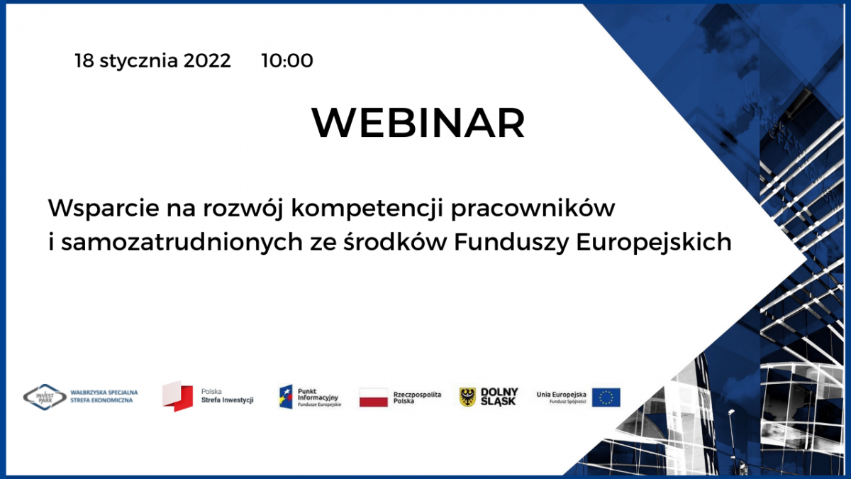 Wałbrzyska Specjalna Strefa Ekonomiczna "INVEST-PARK" wspólnie z przedstawicielem Głównego Punktu Informacyjnego Funduszy Europejskich przy Urzędzie Marszałkowskim Województwa Dolnośląskiego zaprasza na bezpłatne webinarium: Wsparcie na rozwój kompetencji pracowników i samozatrudnionych ze środków Funduszy Europejskich, które odbędzie się 18 stycznia br. o godzinie 10:00.