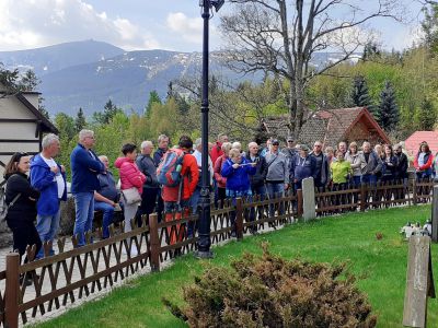 W piątkowe popołudnie dnia 13 maja br. prawie 50-osobowa grupa członków i sympatyków Stowarzyszenia Miłośników Krasiejowa udała się na wycieczkę, aby poznawać zachodnią część Dolnego Śląska. Trzydniowy wyjazd majowy okazał się strzałem w dziesiątkę, dopisała piękna słoneczna pogoda, zwiedzane obiekty wzbudzały zachwyt uczestników wycieczki, a widoczne na horyzoncie pasmo Karkonoszy ze Śnieżką w tle przyciągało naszą uwagę każdego dnia. Zakwaterowaliśmy się w Karpaczu w hotelu „Królowa Karkonoszy”, z pobytu tam byliśmy bardzo zadowoleni. W piątek po kolacji, odbyliśmy spacer po Karpaczu w towarzystwie „ducha gór”, pozwalającego nam zgłębiać karkonoskie tajemnice, a kolejne godziny spędziliśmy na miłych rozmowach w hotelu.