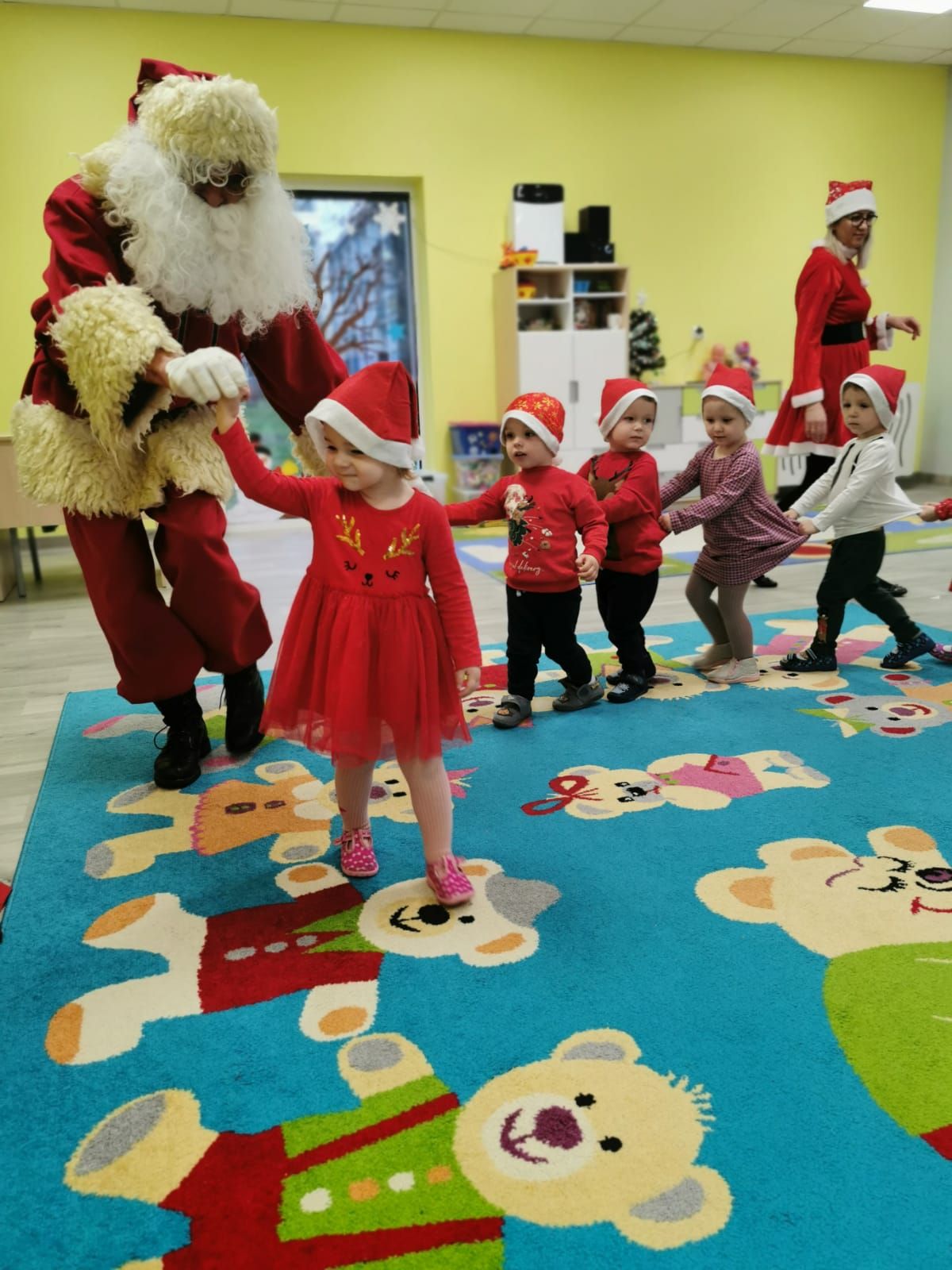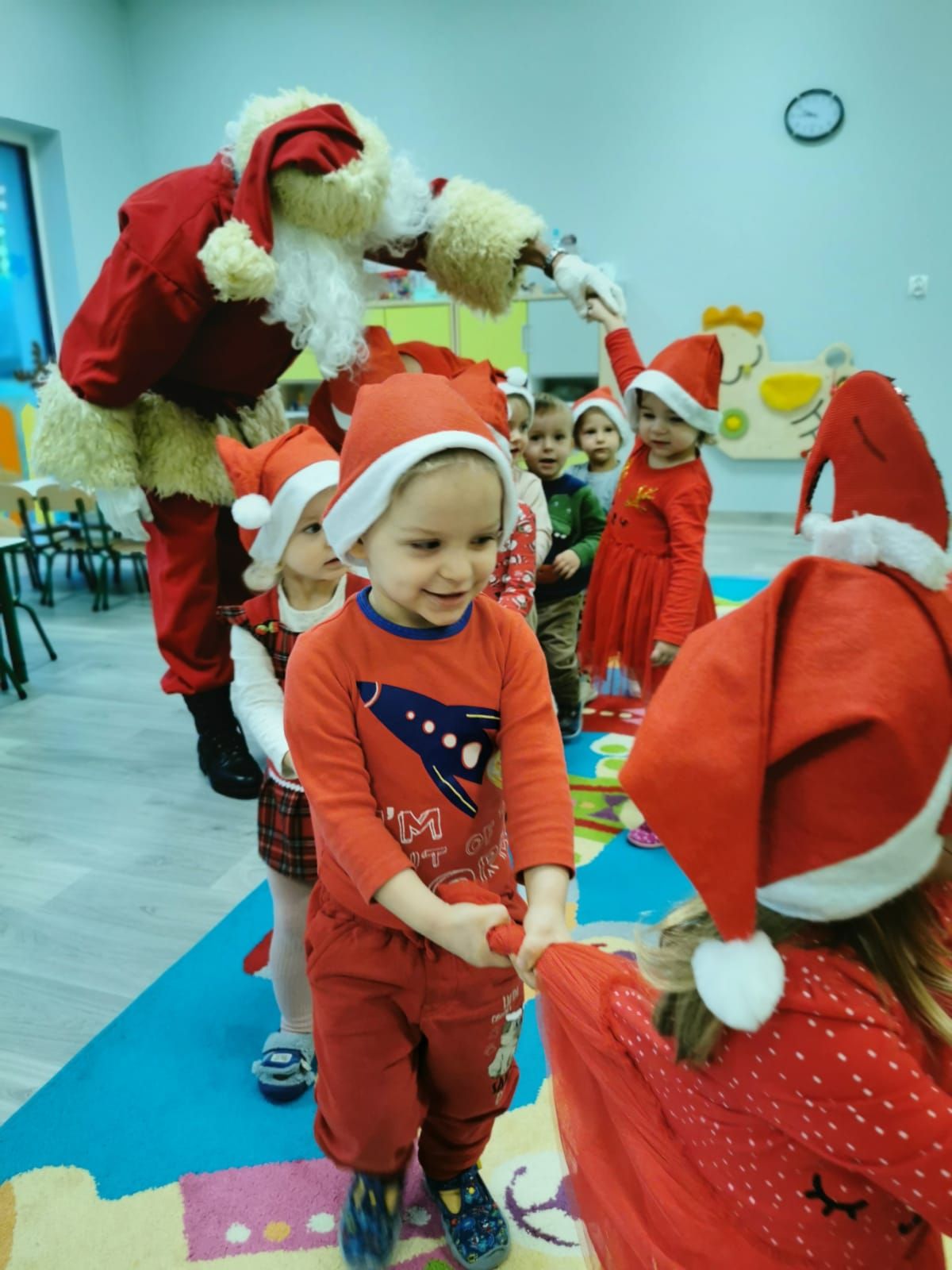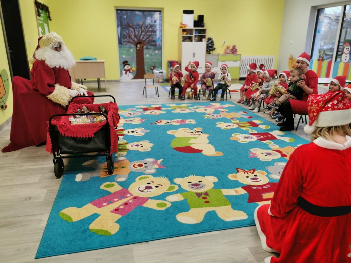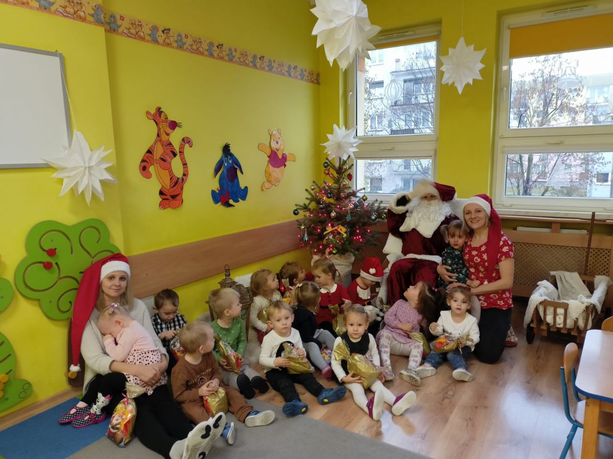 Mikołaj w Żłobku to szczególnie ważne wydarzenie dla wszystkich dzieci. Już pod koniec listopada Maluszki uczyły się piosenek i tańców by powitać upragnionego gościa. Od samego rana wyczekiwały Świętego nasłuchując radosnego okrzyku „hoł, hoł, hoł”. Aż w końcu rozległo się dźwięk dzwoneczka i w progu stanął ON…Święty Mikołaj. Miał czerwony strój, długą białą brodę, na nosie okulary i worek z prezentami.