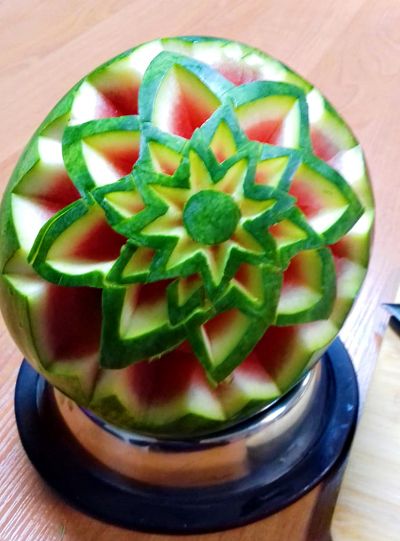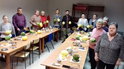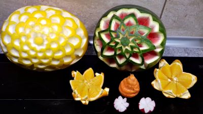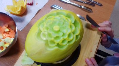 Kilka dni później poznaliśmy historię powstania Carvingu i wykonaliśmy rzeźbienie w owocach zgodnie z tą sztuką pod okiem utytułowanego mistrza tej dyscypliny - Daniela Bewko. Po prawie trzech godzinach intensywnej pracy uzyskaliśmy piękne rzeźby owocowe. Mimo iż uczestnicy po raz pierwszy mogli poznać techniki rzeźbienia kilku rodzajach owoców i inne tajniki carvingu, końcowe kompozycje i dekoracje były wyjątkowo dobrze wykonane.