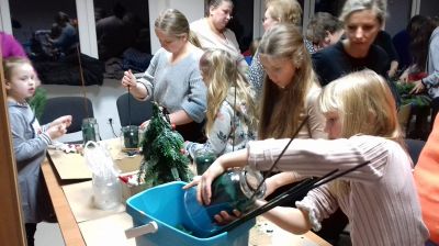 Podczas pierwszych warsztatów - rękodzieła świątecznego pod okiem florystki Katarzyny Sklorz wykonywano wieńce adwentowe. Natomiast dzieci, które przybyły z rodzicami, wykonywały piękne choinki przyozdobione świątecznymi elementami. Każda dekoracja była wyjątkowa