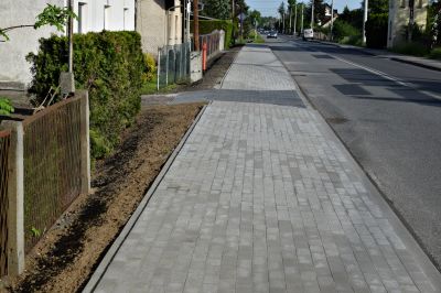 Ustawiono nowe krawężniki oraz obrzeża wzdłuż remontowanego odcinka chodnika, wykonano roboty ziemne pod konstrukcję, poszczególne warstwy konstrukcyjne i nową nawierzchnię chodnika z betonowej, bezfazowej kostki brukowej.