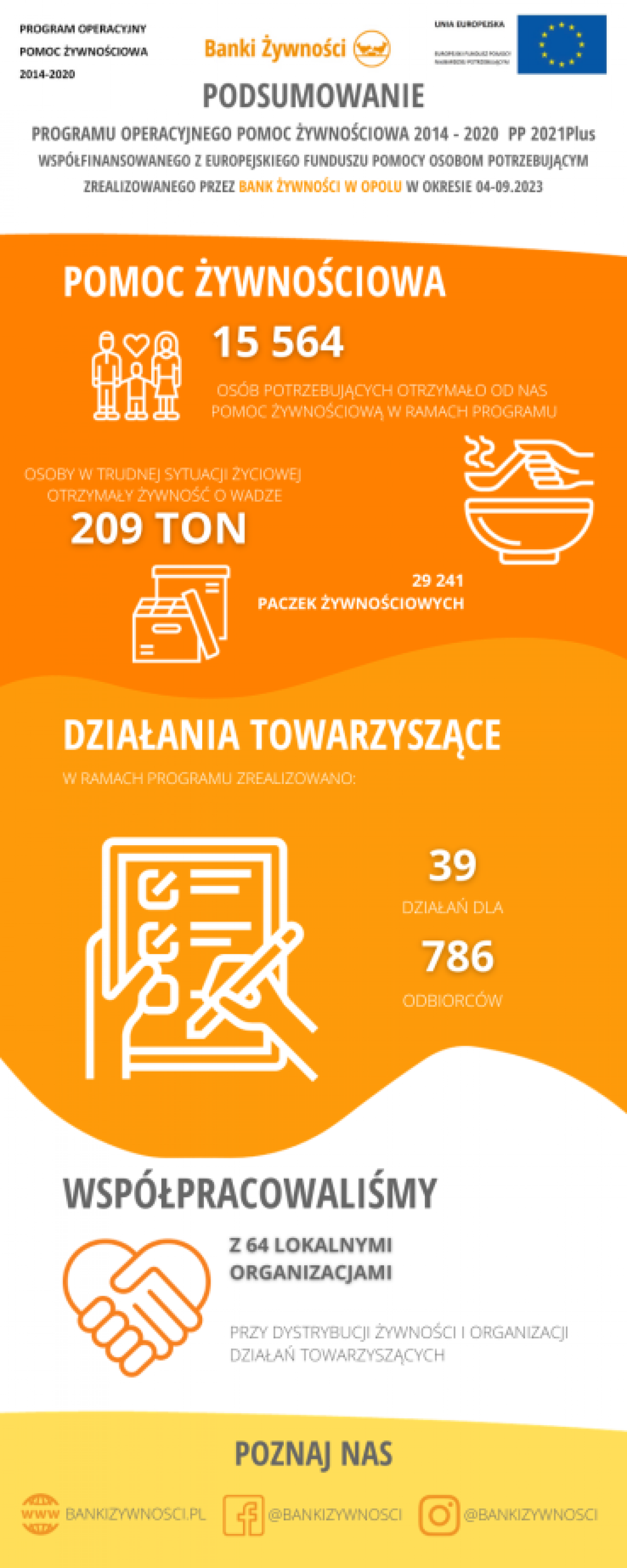 Urząd Gminy i Miasta w Ozimku oraz Ośrodek Integracji i Pomocy Społecznej w Ozimku z terenu województwa opolskiego przy współpracy z Bankiem Żywności w Opolu realizowali Program Operacyjny Pomoc Żywnościowa 2014-2020 Podprogram 2021 Plus współfinasowany z Europejskiego Funduszu Pomocy Najbardziej Potrzebującym, którego celem było zapewnienie najuboższym mieszkańcom Polski pomocy żywnościowej oraz uczestnictwa w działaniach w ramach środków towarzyszących w okresie kwiecień 2023 – wrzesień 2023.