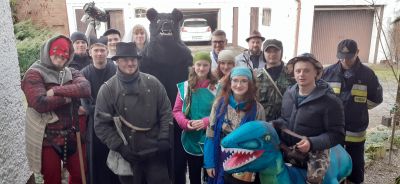 Następnie wsiedli na piękną podwodę, która wiozła ich na ulicę Brzeziny. Po drodze zatrzymywali samochody, udzielali upomnień (nawet policji) i wręczali mandaty. Obowiązkowo podczas odwiedzin gospodynie tańczyły z Berem, co zapewnić ma szczęście w przyszłości. Korowód był bardzo liczny i barwny. A w Krasiejowie, w odróżnieniu od innych wsi, do niedźwiedzia dołącza wspaniały dinozaur. I w końcu nie wiadomo, czy u nas chodzą Bery czy Dinozaur z niedźwiedziem. Grupie towarzyszyła głośna muzyka, przeróżne hałasy i okrzyki. Dziękujemy uczestnikom tradycyjnego wodzenia niedźwiedzia za odwiedziny, a mieszkańcom za datki, które mają szczytny cel - zakup nowego wozu strażackiego. Po południu w Starej Szkole dzieci mogły uczestniczyć w przygotowanych przez panią Ewę Kotysz animacjach, a wieczorem odbyła się zabawa taneczna dla dorosłych. Brawo strażacy z OSP Krasiejów z prezesem Tomaszem Chudalą na czele za przygotowanie tego wyjątkowego wydarzenia.