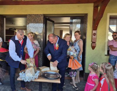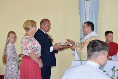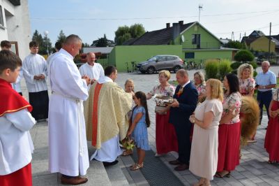 Kolejnym punktem programu, było przekazanie chleba dożynkowego przez starostów dożynek Ewę i Henryka Sladek na ręce włodarza gminy – Burmistrza Ozimka Mirosława Wieszołka. Po pobłogosławieniu chleba przez ks. Łukasza Szustra przystąpiono do pokrojenia i podzielenia go wśród zgromadzonych, tak aby nikomu go nigdy nie zabrakło.