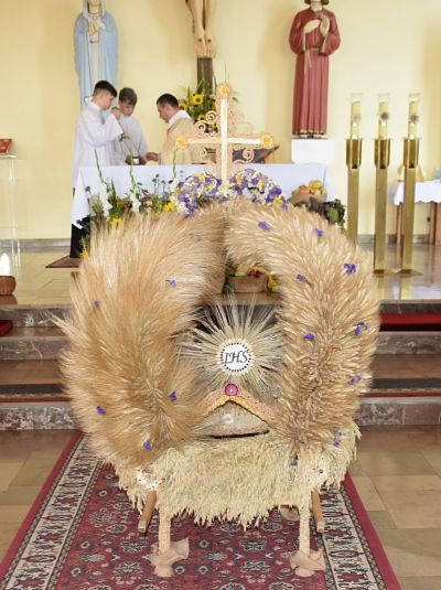 Uroczystości tradycyjnie rozpoczęły się od mszy św. dziękczynnej w intencji wszystkich rolników, którą odprawił ks. Łukasz Szuster. Na wstępie nastąpiło wprowadzenie korony dożynkowej oraz starostów z chlebem dożynkowym do kościoła, który został ofiarowany podczas eucharystii. Dla wszystkich wiernych przygotowano tradycyjne bułeczki, które wręczano im podczas mszy.