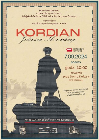 Zapraszamy mieszkańców gminy na Narodowe Czytanie „Kordiana” Juliusza Słowackiego, które odbędzie się w sobotę 7 września 2024 roku o godz. 10:00 na skwerku koło Domu Kultury w Ozimku. Wydarzenie organizowane jest w ramach 13. edycji ogólnopolskiej akcji pod Patronatem Honorowym Pary Prezydenckiej. Wybrane fragmenty I i II aktu sztuki, poświęcone dojrzewaniu Kordiana, odczyta Burmistrz Ozimka Mirosław Wieszołek oraz przedstawiciele Rady Miejskiej w Ozimku i Młodzieżowej Rady Miejskiej.