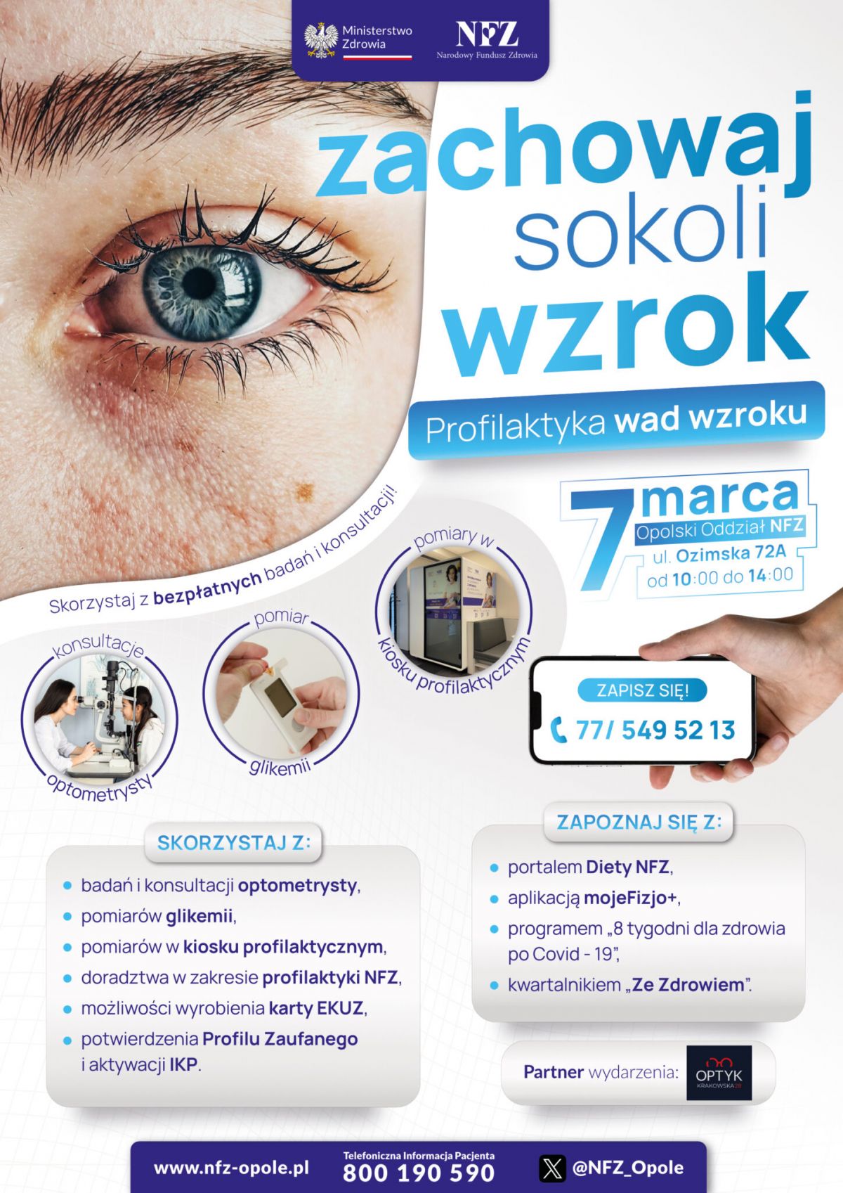 Szanowni Państwo, Opolski Oddział NFZ zaprasza na konsultacje i badania wzroku z okazji Dnia Kobiet w dniu 07 marca 2025 r. w godz. 10.00 - 14.00. Schorzenie narządu wzroku w ostatnich czasach jest chorobą cywilizacyjną. Pracujemy dużo przy komputerze, oglądamy telewizję, przebywamy długi czas przy sztucznym oświetleniu. Wszystkie te czynniki powodują, że nasz wzrok pogarsza się. Bardzo ważna jest profilaktyka wzroku, regularne wizyty kontrolne uokulisty, stosowanie szkieł korygujących. Podczas dnia otwartego będzie można skorzystać z: * badania i konsultacji optometrysty, * pomiarów glikemii, * pomiarów w kiosku profilaktycznym, * doradztwa w zakresie profilaktyki NFZ, * możliwości wyrobienia karty EKUZ, * potwierdzenia Profilu Zaufanego i aktywacji IKP. Zapoznaj się z: * portalem Diety NFZ, * aplikacją mojeFizjo+, * programem "8 tygodni dla zdrowia po Covid - 19", * kwartalnikiem Ze Zdrowiem. Lokalizacja wydarzenia: Opolski Oddział Wojewódzki Narodowego Funduszu Zdrowia w Opolu ul. Ozimska 72A