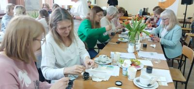 W przerwie Panie mogły skorzystać z przygotowanego przez Panią Karinę Piontek poczęstunku owocowego, orzechowego i ciasta. Po takiej lekcji zdrowego odżywiania i dawce wiadomości dietetycznych, nie wszystkie chciały sięgać po słodkości. Końcowym etapem spotkania było sporządzanie ziołowych herbat wieloskładnikowych. W miskach uczestniczki zajęć mieszały w określonych proporcjach brzozę, mniszek, czystek, bez czarny i pokrzywę. Wykonaną mieszankę ziół zapakowaną do torebek można było zabrać do domu, podobnie jak przygotowaną w słoiczku maseczkę na twarz.