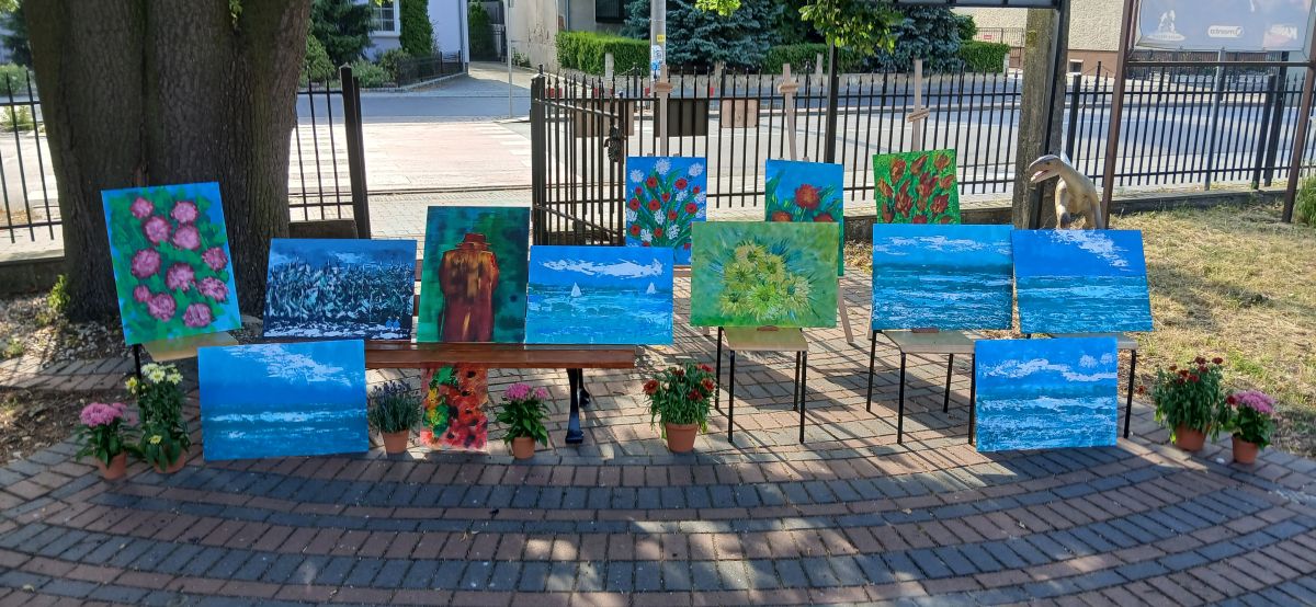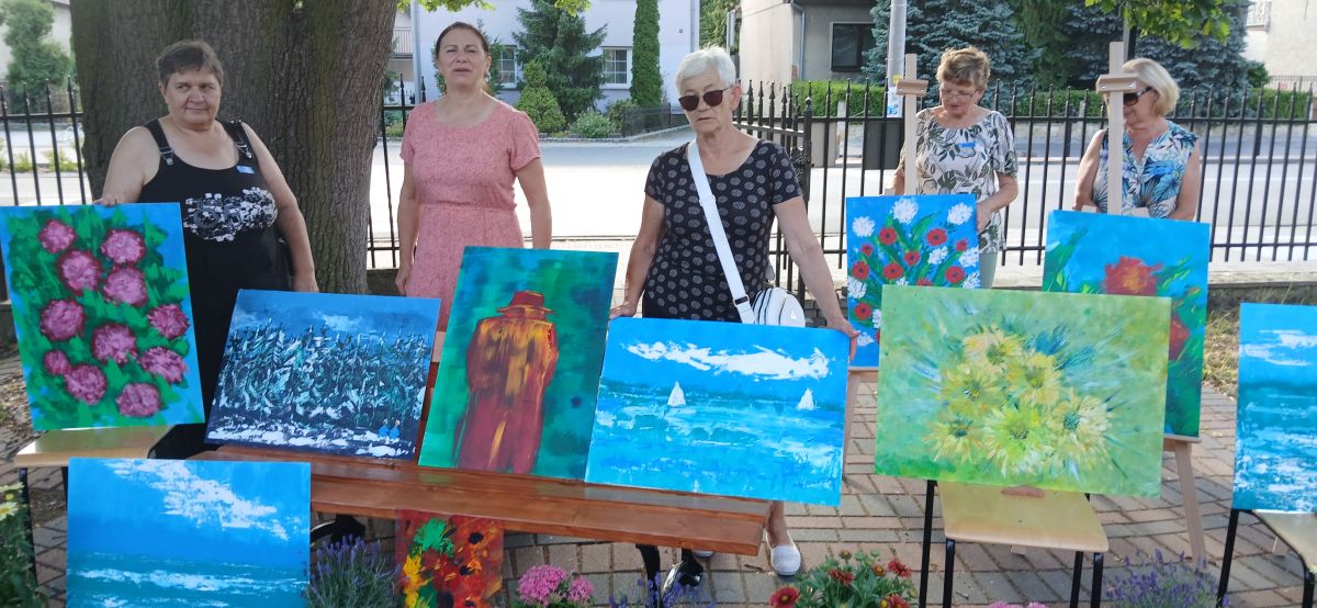 Podzieliłyśmy się na dwie grupy, jedne panie malowały barwne kwiaty nawiązując do pięknej pogody i barw lata, a inne, kierując się sugestią Pana Romana malowały elementy marynistyczne marząc o wypoczynku nad morzem. Na obrazach mieszały się odcienie zieleni, turkusu rozświetlone białą barwą falującego morza czy chmur na niebie, a czasami żaglówki kołyszącej się na wodzie.