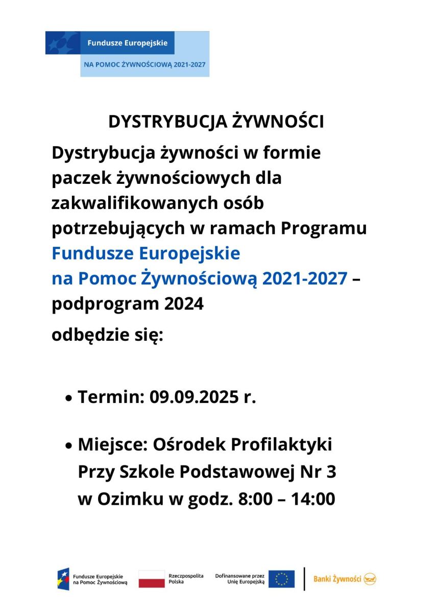 Dystrybucja żywności w ramach Programu Fundusze Europejskie na Pomoc Żywnościową 2021-2027 podprogram 2024