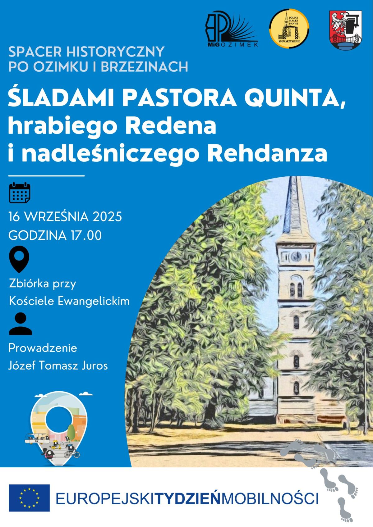 Trasa liczy około 3 km. Wyruszymy z parkingu obok zabytkowego kościoła, aby wzdłuż brzegu Małej Panwi dojść do ulicy Młyńskiej w Krasiejowie. Następnie wrócimy ulicą Brzeziny aż do Parku Rehdanza. Po drodze nasz przewodnik i wybitny znawca historii lokalnej zdradzi nam wiele ciekawostek o niezwykłych postaciach związanych z Ozimkiem, w tym opowie o pastorze Quincie - niezmordowanym miłośniku długich pieszych wędrówek (często odbywanych na bosaka).