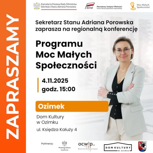 Gmina Ozimek jest partnerem wyjątkowego wydarzenia „Moc Małych Społeczności”, które odbędzie się 4 listopada o godz. 15:00 w Domu Kultury w Ozimku.