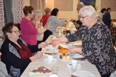 Ta część spotkania upłynęła przy poczęstunku ciastem, kawą i makówką, której nie może zabraknąć na żadnym wigilijnym stole. Kolędy śpiewał zespół Dzióbki wspólnie z dziećmi z rodzin Styrnol i Kierot oraz solistka – Marcelinka Kierot. Miłym akcentem było złożenie życzeń i odśpiewanie „Sto lat” jubilatce – obchodzącej 90. urodziny pani Krystynie Niedzieli, najstarszej uczestniczce wigilijnego spotkania.