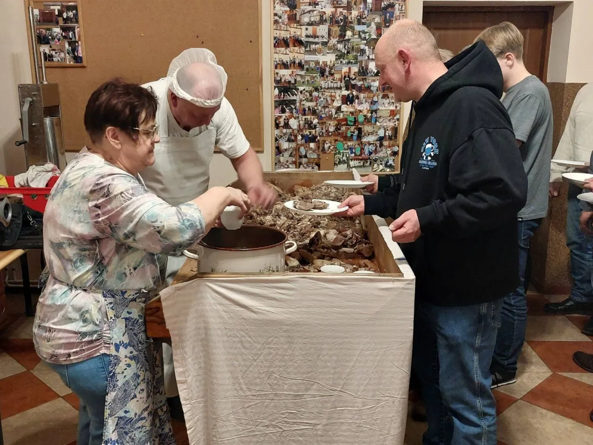 Już w południe w wiacie za świetlicą rozpalono ogień pod kotłem, w którym gotowało się mięso, a impreza rozpoczęła się o godzinie 16.00 od poczęstunku pajdą chleba z domowym smalcem i kiszonym ogórkiem. Gdy mięso w kotle „doszło”, uczestników zaproszono na poczęstunek „werflaischem” i zupą, czyli tradycyjną śląską potrawą serwowaną bezpośrednio po świniobiciu, składającą się z gotowanych w kotle kawałków mięsa – głowizny, podgardla i podrobów oraz aromatycznego wywaru.