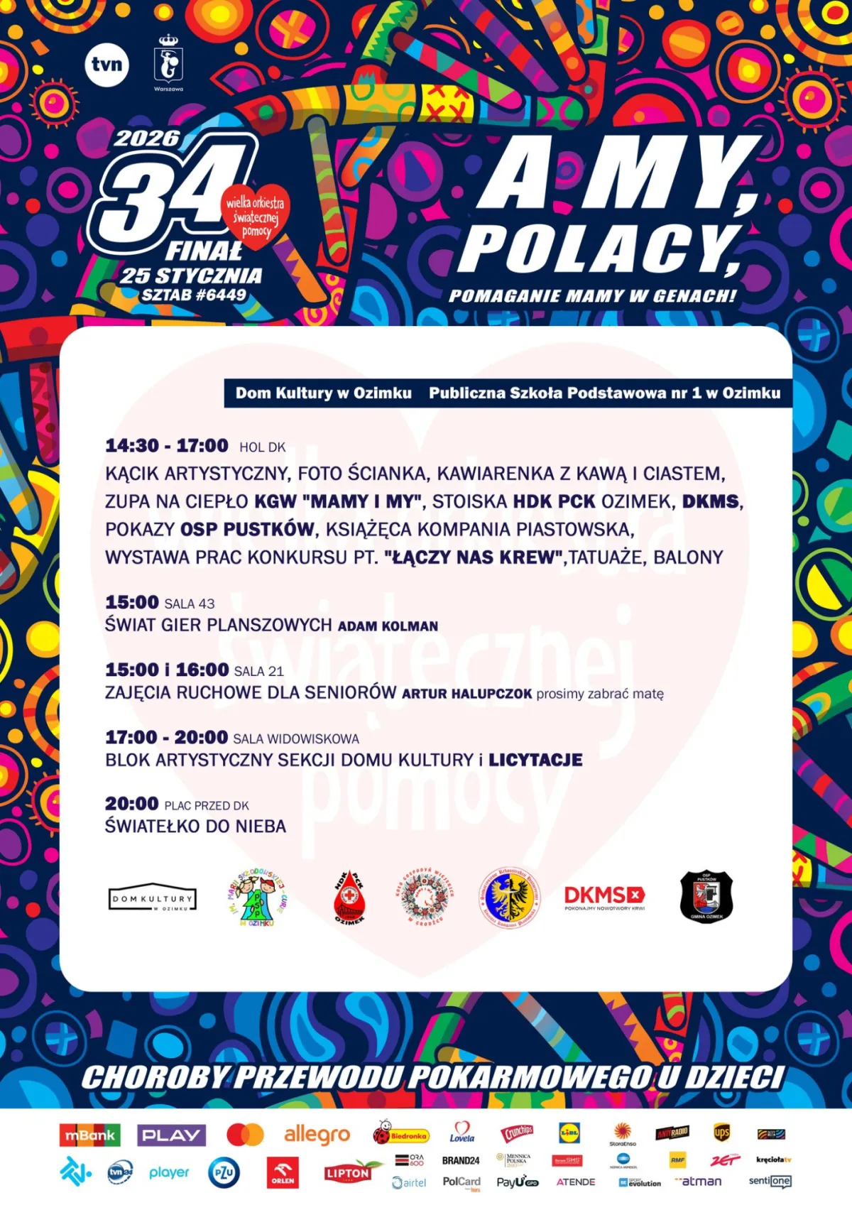 Zapraszamy mieszkańców Gminy i Miasta Ozimek do udziału w 34. Finale Wielkiej Orkiestry Świątecznej Pomocy, który odbędzie się 25 stycznia 2026 r. w Domu Kultury w Ozimku.