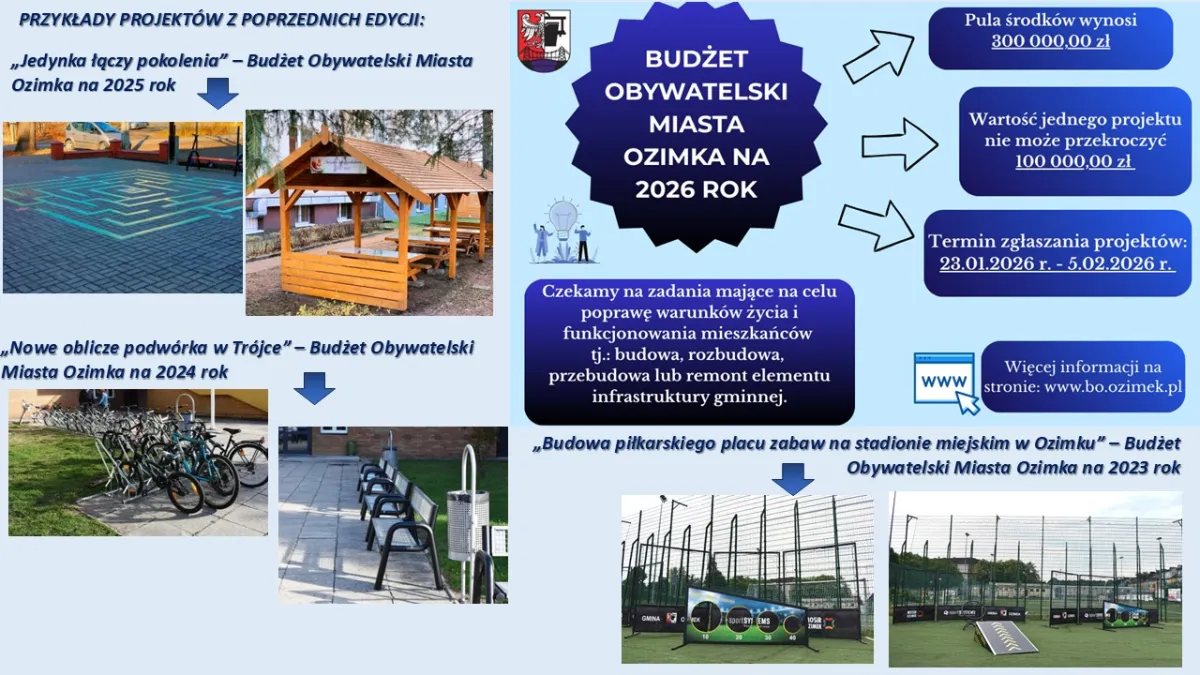 Zachęcamy wszystkich mieszkańców do udziału w Budżecie Obywatelskim i aktywnego włączania się w proces decydowania o kierunkach rozwoju naszego miasta. Państwa pomysły mają realny wpływ na przyszłość Ozimka.