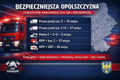 Zachęcamy wszystkich mieszkańców do udziału w głosowaniu. Państwa głos może przyczynić się do wyszkolenia nowych kierowców i ratowników, usprawnienia wyjazdów do akcji oraz zwiększenia bezpieczeństwa rodzin i całej Opolszczyzny.