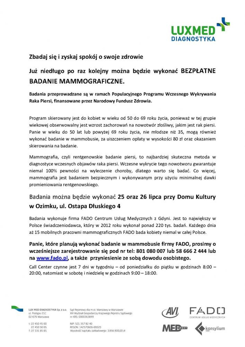 Panie, które planują wykonać badanie w mammobusie firmy FADO, prosimy o wcześniejsze zarejestrowanie się pod nr tel: 801 080 007 lub 58 666 2 444 lub na www.fado.pl, a także przyniesienie ze sobą dowodu osobistego.