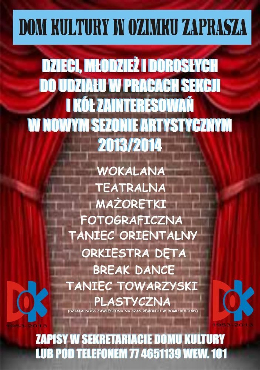 Od sierpnia rozpoczynamy zapisy do sekcji i kół zainteresowań działających w Domu Kultury w Ozimku. Serdecznie zapraszamy dzieci, młodzież i osoby dorosłe, które w nowym sezonie artystycznym 2013/2014 chcą rozwijać swoje pasje. Oferujemy możliwość udziału w pracach sekcji wokalnej, teatralnej, tanecznej (mażoretki, taniec towarzyski, break dance, taniec orientalny), fotograficznej, plastycznej (rozpocznie działalność po zakończeniu remontu sali widowiskowej i zaplecza) oraz orkiestrze dętej.
