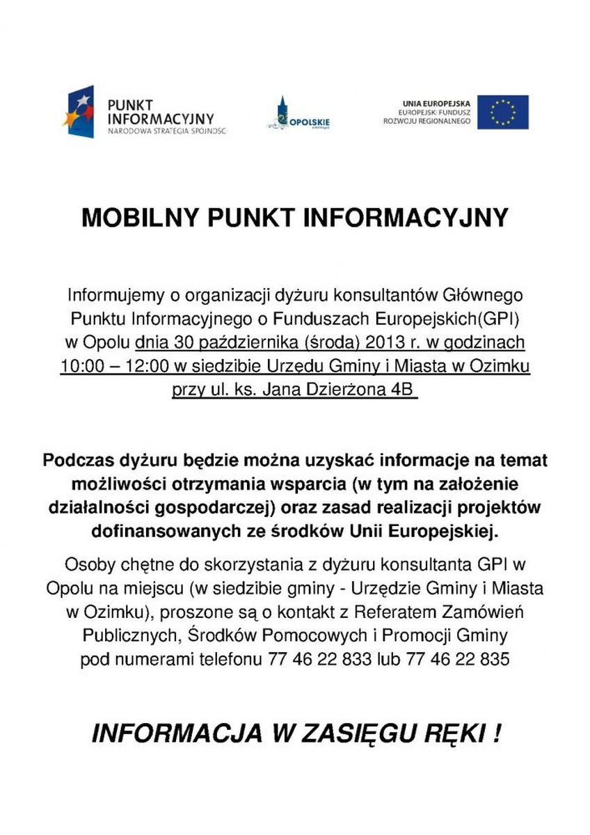 Osoby chętne do skorzystania z dyżuru konsultanta GPI w Opolu na miejscu (w siedzibie gminy - Urzędzie Gminy i Miasta w Ozimku), proszone są o kontakt z Referatem Zamówień Publicznych, Środków Pomocowych i Promocji Gminy