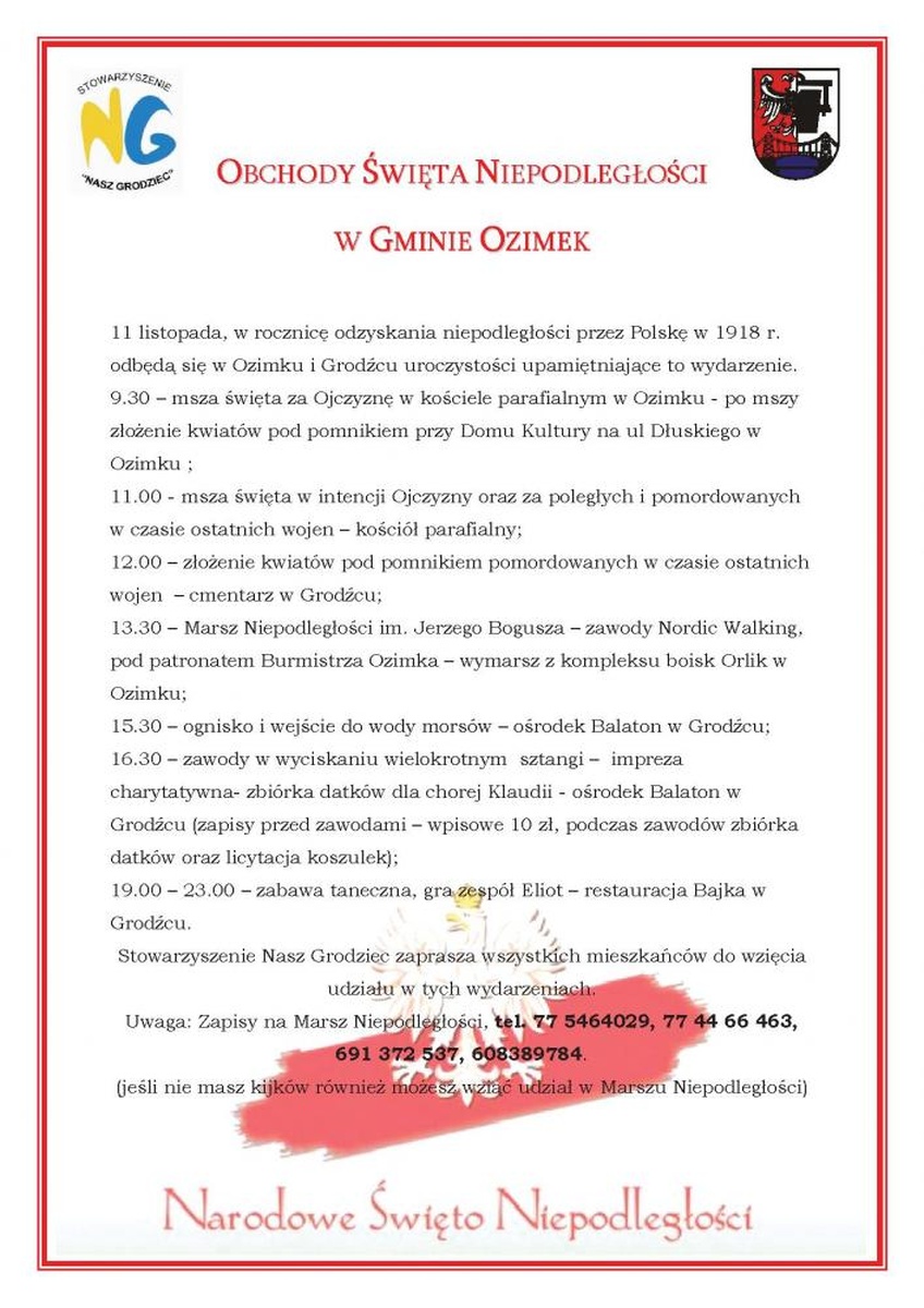 11 listopada, w rocznicę odzyskania niepodległości przez Polskę w 1918 r. odbędą się w Ozimku i Grodźcu uroczystości upamiętniające to wydarzenie. Szczegóły na plakacie.