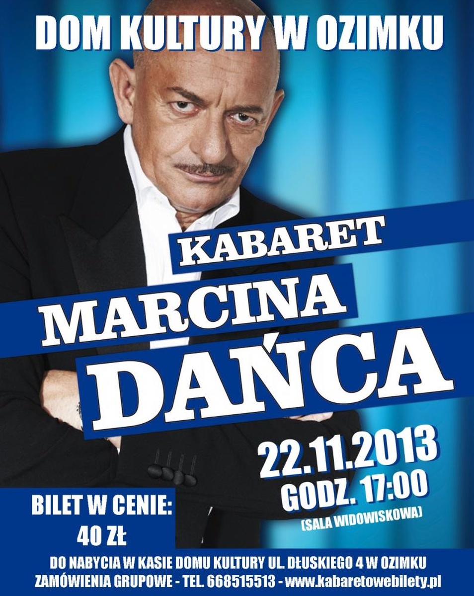 Zapraszamy na KABARET MARCINA DAŃCA, który odbędzie się dnia 22.11.2013 o godz. 17:00 na sali widowiskowej Domu Kultury w Ozimku, ul. Dłuskiego 4, 46-040 Ozimek.