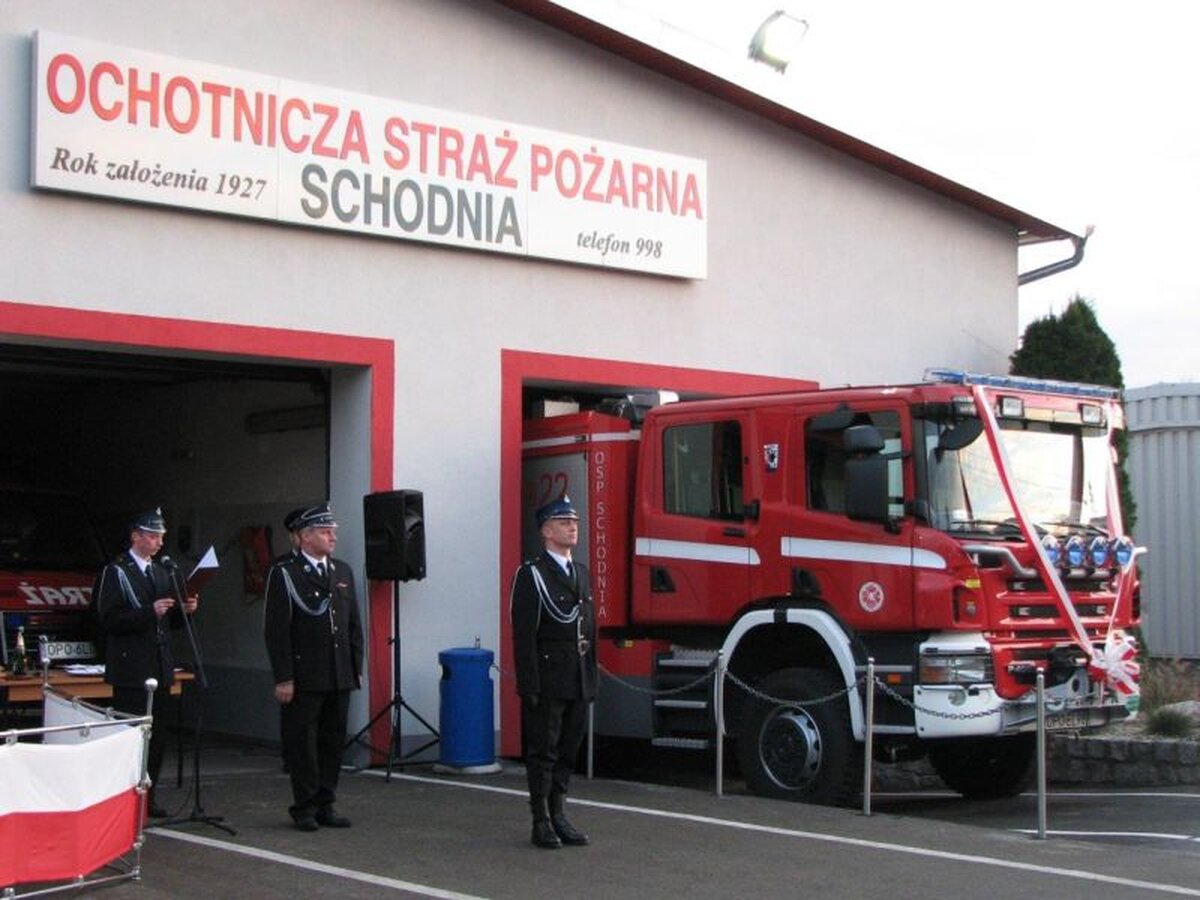 Nowy samochód to SCANIA GCBA 5/32, której wartość wraz z wyposażeniem wynosi około 900 tys. zł. Zakupu dokonano przy finansowym wparciu Gminy Ozimek (dotacja wynosiła ponad 300 tyś. zł), Zarządu Głównego OSP RP, Komendy Wojewódzkiej PSP w Opolu, Ministerstwa Spraw Wewnętrznych oraz środków własnych OSP Schodnia. Samochód został zbudowany w firmie Szcześniak w Bielsku-Białej, specjalizującej się w budowie samochodów specjalnych. W uroczystości przekazania samochodu uczestniczyli liczni goście, na czele z wiceministrem spraw wewnętrznych Stanisławem Rakoczym, komendantem wojewódzkim Państwowej Straży Pożarnej w Opolu nadbrygadierem Karolem Stępniem, wiceprezes Zarządu Głównego Związku OSP RP Teresą Tiszbierek, przedstawicielami władz województwa, powiatu opolskiego i gminy Ozimek – z burmistrzem Markiem Korniakiem i przewodniczącym Rady Miejskiej Joachimem Wiesbachem. Obecne też były delegacje z pocztami sztandarowymi jednostek OSP naszej gminy oraz zaprzyjaźnionej jednostki strażackiej z Ryżoviste w Czechach. Akt przekazania samochodu, wraz z kluczykami i dokumentami, odebrał prezes OSP Schodnia Marek Elis. Po poświęceniu samochodu przez uczestniczących w ceremonii księży, odbyły się jego „chrzciny”. Rodzicami chrzestnymi nowego wozu strażackiego zostali Marek Korniak i Teresa Tiszbierek. W przemówieniach wszyscy życzyli strażakom ze Schodni, by nowy samochód służył im długo i dobrze. OSP Schodnia wraz z jednostkami z Krasiejowa oraz Szczedrzyka, należy do Krajowego Systemu Ratowniczo-Gaśniczego, a więc od jej wyposażenia oraz sprawności w dużym stopniu zależy bezpieczeństwo mieszkańców naszej gminy.