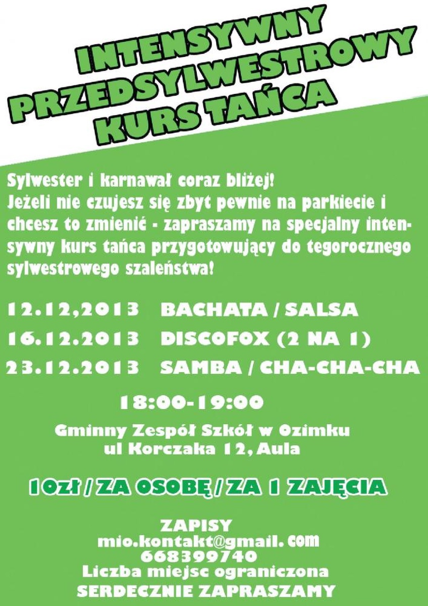Sylwester i karnawał coraz bliżej, jeżeli nie czujesz się zbyt pewnie na parkiecie i chcesz to zmienić – zapraszamy na specjalny intensywny kurs tańca przygotowujący do tegorocznego sylwestrowego szaleństwa. Więcej informacji na plakacie.