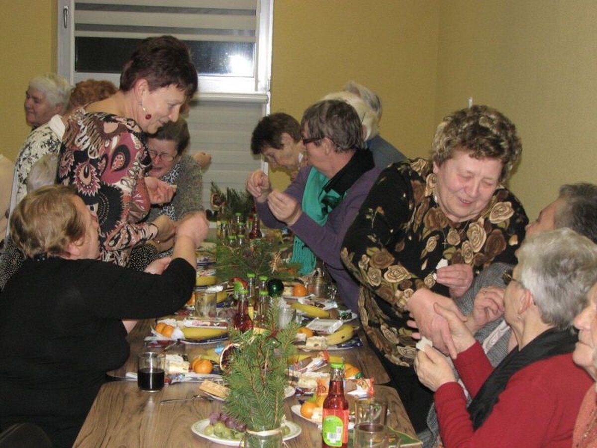 Przy poczęstunku kawą, ciastem, owocami i słodyczami uczestnicy spotkania wysłuchali pierwszej części kolędowego koncertu, po czym świąteczno-noworoczne życzenia złożyli im: sołtys Zdzisław Adamski, burmistrz Ozimka Marek Korniak i przewodnicząca parafialnego zespołu Caritas Teresa Kałamarz. Dzieląc się świątecznym opłatkiem, nawzajem składano sobie życzenia zdrowia i wszelkiej pomyślności. Po złożonych życzeniach, wszyscy zasiedli do tradycyjnego wigilijnego posiłku: smażonej ryby z ziemniakami i kapustą. Na zakończenie swój bogaty świąteczny repertuar powtórnie zaprezentował zespół „Grodziec”, wraz z którym obecni na sali seniorzy śpiewali kolędy i wspominali czasy swojego dzieciństwa – Święta Bożego Narodzenia spędzane na Kresach Wschodnich.