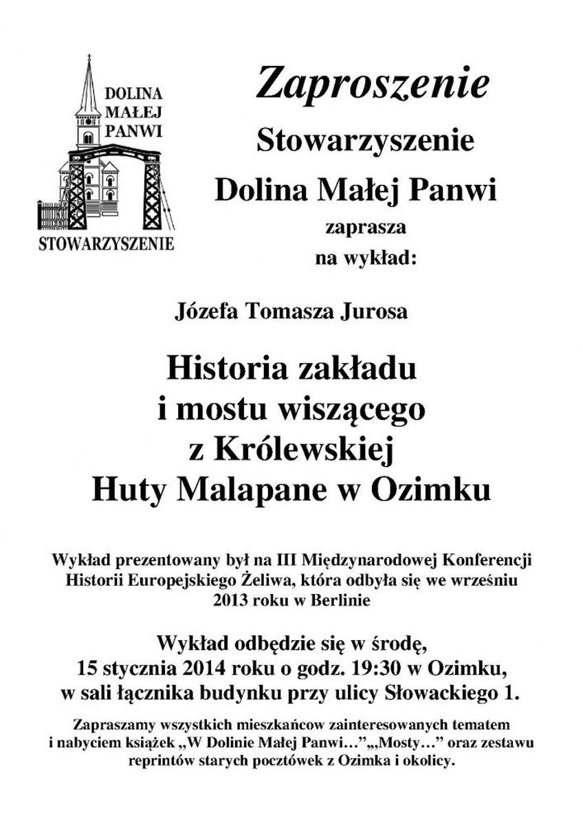 Stowarzyszenie Dolina Małej Panwi zaprasza na kolejny wykład zatytułowany "Historia zakładu i mostu wiszącego z Królewskiej Huty Malapane w Ozimku".