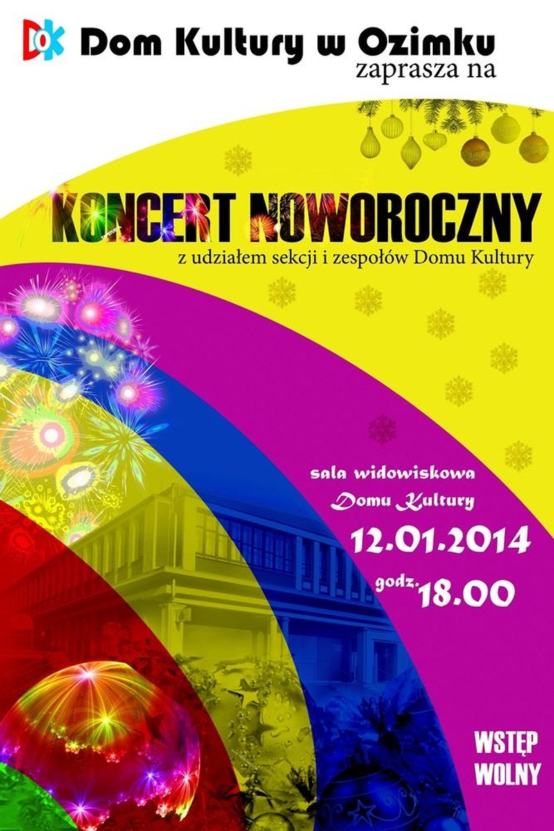Zapraszamy do wzięcia udziału w Koncercie Noworocznym, który odbędzie się 12 stycznia o godz. 18.00 na sali widowiskowej Domu Kultury. W koncercie wezmą udział sekcje i zespoły działające w Domu Kultury.