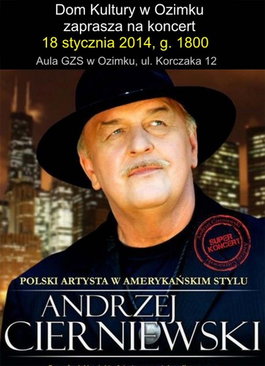 Dom Kultury w Ozimku zaprasza na koncert Andrzeja Cierniewskiego z okazji Dnia Babci. Artysta wystąpi w Auli Gminnego Zespołu Szkół w Ozimku (ul. Korczaka 12) w dniu 18 stycznia 2014r. o godz. 18.00