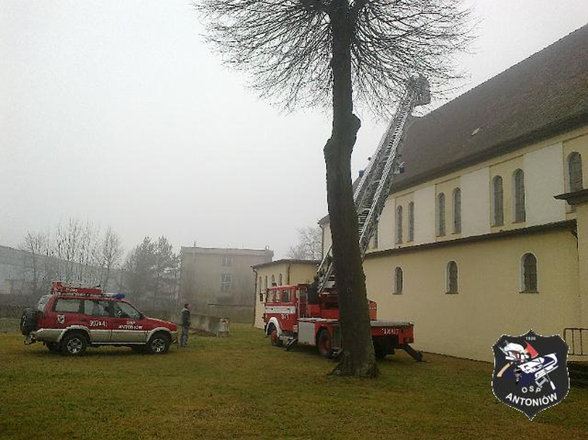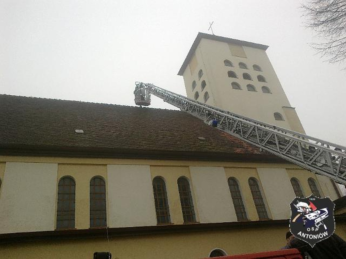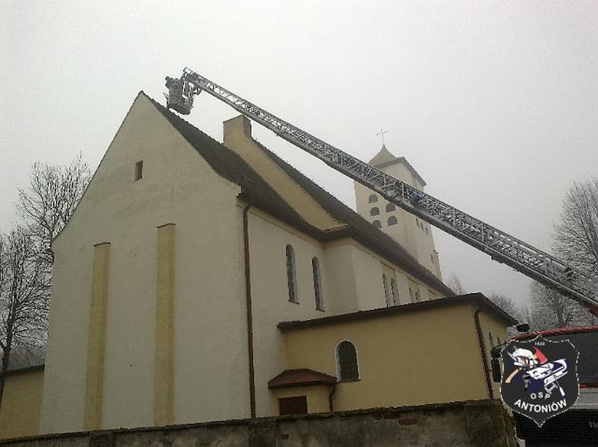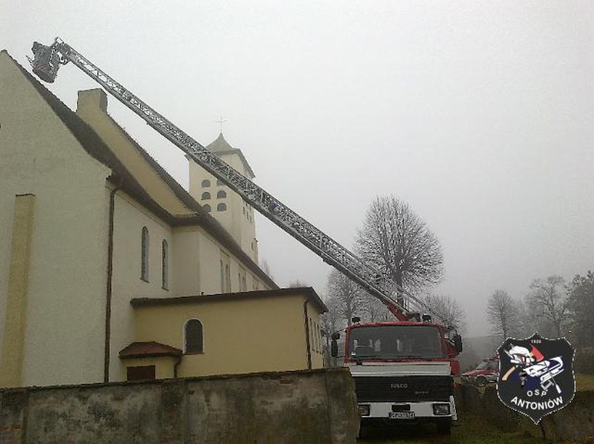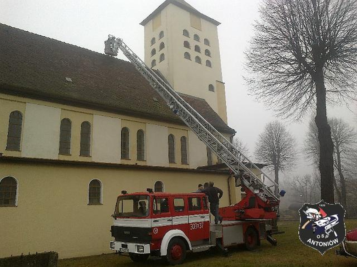 Po ostatnich między świątecznych wichurach, zerwanych zostało kilkanaście gąsiorów dachowych kościoła. Dzięki pomocy Prezesa OSP Schodnia Marka Elisa, który udostępnił drabinę jego jednostki, można było sprawnie przeprowadzić szybki remont, osadzając uszkodzone gąsiory na zaprawie. Paweł oraz Grzegorz z OSP Antoniów poradzili sobie z problemem bardzo fachowo. Kościół ma dla strażaków z Antoniowa bardzo duże znaczenie i pewną ikoną, gdyż większość mieszkańców ich miejscowości zostało w nim ochrzczonych oraz przystąpiło do Pierwszej Komunii Św.