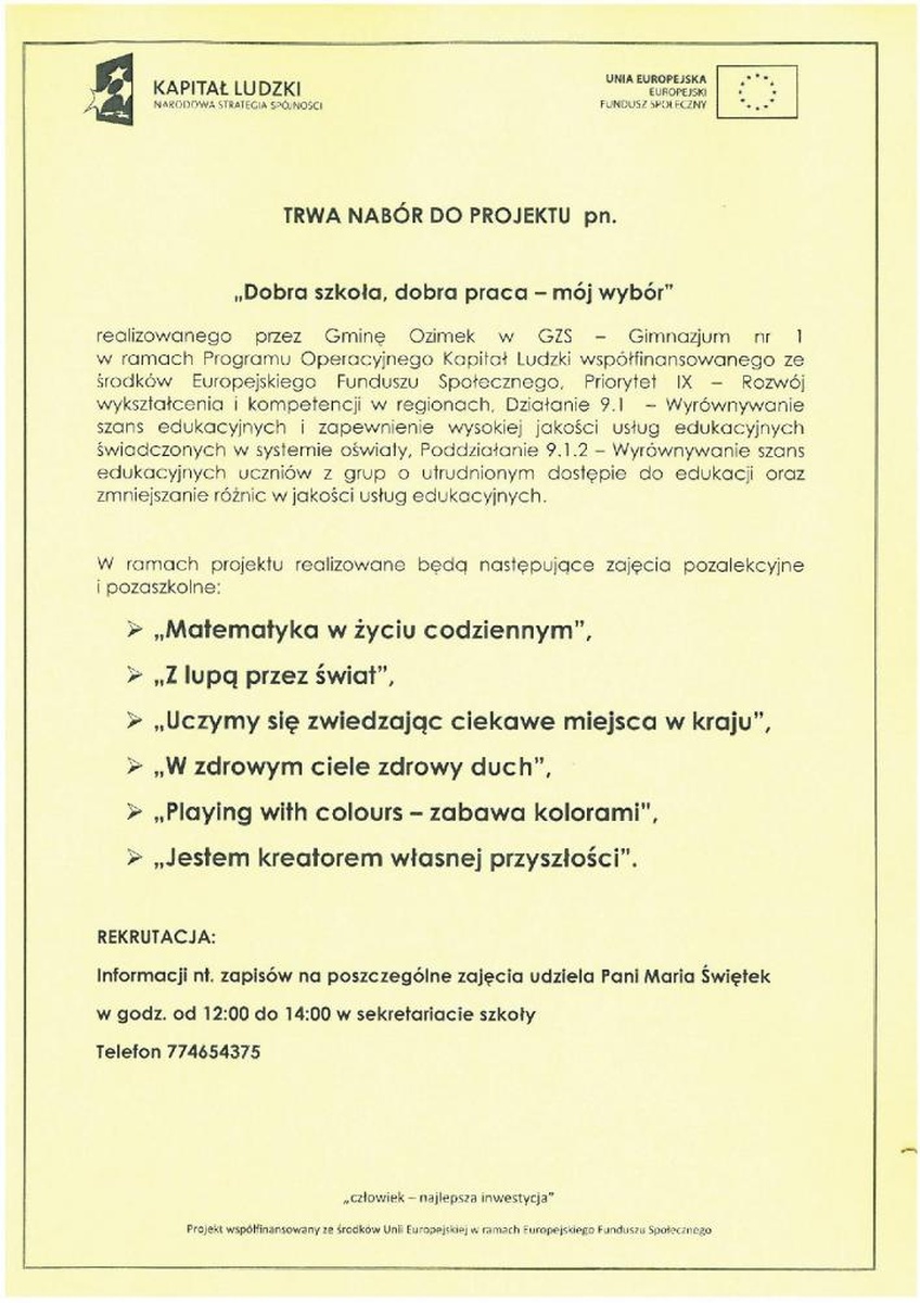 Trwa nabór do projektu „Dobra szkoła, dobra praca – mój wybór” realizowanego przez Gminę Ozimek w GZS – Gimnazjum nr 1 w ramach Programu Operacyjnego Kapitał Ludzki współfinansowanego ze środków Europejskiego Funduszu Społecznego, Priorytet IX – Rozwój wykształcenia i kompetencji w regionach, Działanie 9.1 – Wyrównywanie szans edukacyjnych i zapewnienie wysokiej jakości usług edukacyjnych świadczonych w systemie oświaty, Poddziałanie 9.1.2 – Wyrównywanie szans edukacyjnych uczniów z grup o utrudnionym dostępie do edukacji oraz zmniejszanie różnic w jakości usług edukacyjnych.