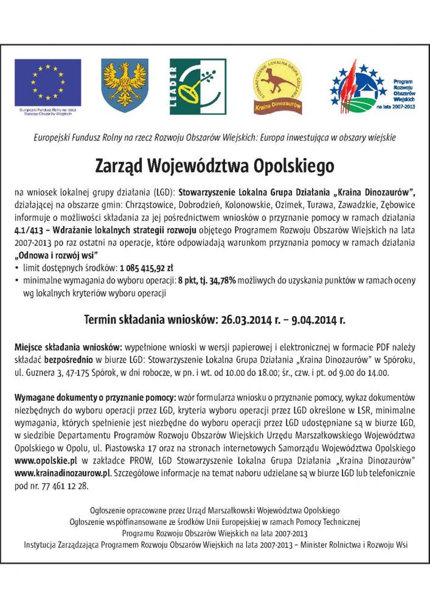 Zarząd Województwa Opolskiego na wniosek lokalnej grupy działania (LGD): Stowarzyszenie Lokalna Grupa Działania „Kraina Dinozaurów”, działającej na obszarze gmin: Chrząstowice, Dobrodzień, Kolonowskie, Ozimek, Turawa, Zawadzkie, Zębowice informuje o możliwości składania za jej pośrednictwem wniosków o przyznanie pomocy w ramach działania 4.1/413 – Wdrażanie lokalnych strategii rozwoju objętego Programem Rozwoju Obszarów Wiejskich na lata 2007-2013 po raz ostatni na operacje, które odpowiadają warunkom przyznania pomocy w ramach działania „Odnowa i rozwój wsi”