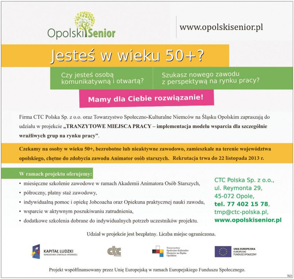 Towarzystwo Społeczno-Kulturalne Niemców na Śląsku Opolskim oraz firma CTC Polska Sp. z o. o. zapraszają do udziału w projekcie „TRANZYTOW MIEJSCA PRACY – implementacja modelu wsparcia dla szczególnie wrażliwych grup na rynku pracy”.