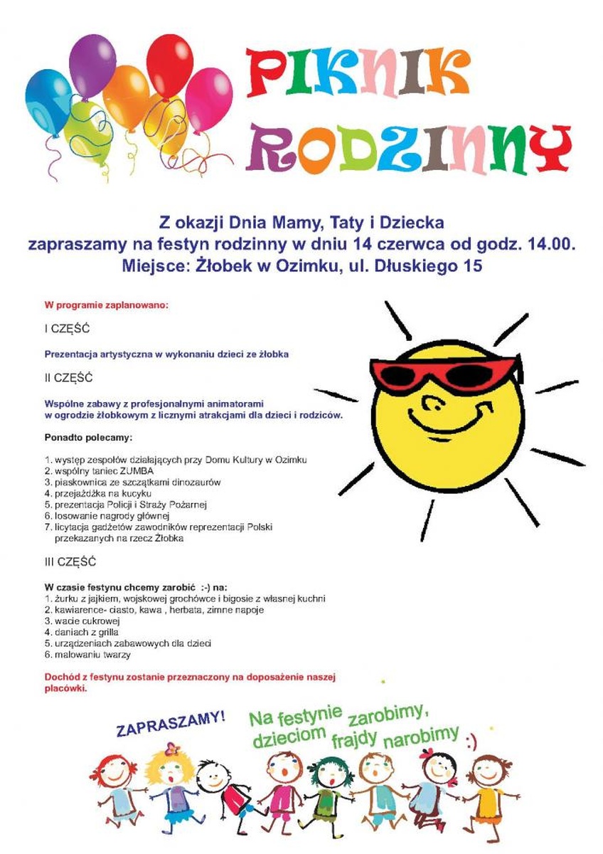 Z okazji Dnia Mamy, Taty i Dziecka zapraszamy na festyn rodzinny w dniu 14 czerwca od godz. 14.00. Miejsce: Żłobek w Ozimku, ul. Dłuskiego 15.