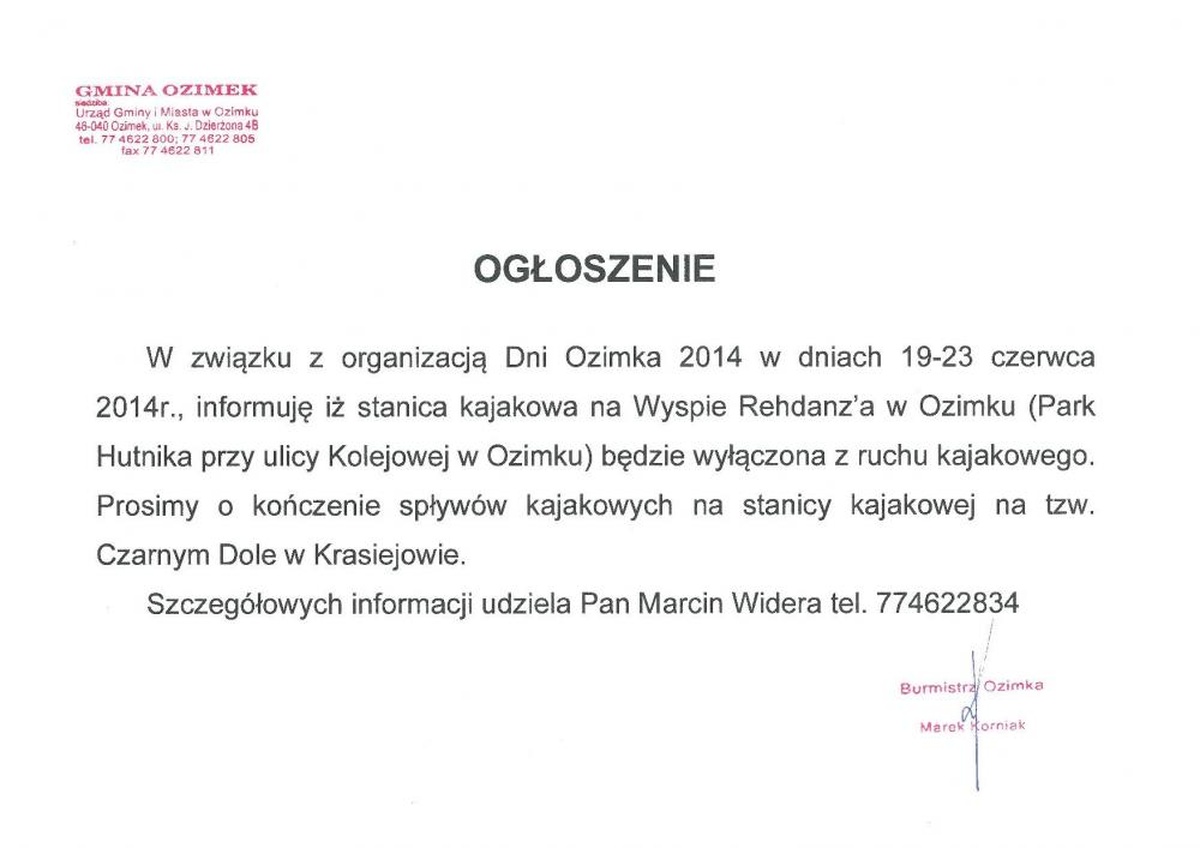 W związku z organizacją Dni Ozimka 2014 w dniach 19-23 czerwca 2014 r., informuję iż stanica kajakowa na Wyspie Rehdanz’a (Parku Hutnika przy ulicy Kolejowej w Ozimku) będzie wyłączona z ruchu kajakowego. Prosimy o kończenie spływów kajakowych na stanicy kajakowej na tzw. Czarnym Dole w Krasiejowie. Za utrudnienia z góry przepraszamy.