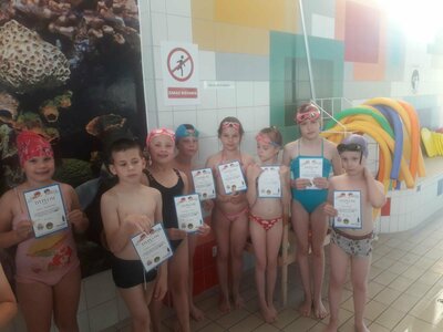 Kurs nauki pływania ukończyło już 45 uczniów, tj. 3 grupy, każda po 15 osób. Po przerwie wakacyjnej kurs rozpoczną kolejne dzieci. Będzie to 6 grup. Każda grupa ma 20 lekcji zajęć na basenie.
