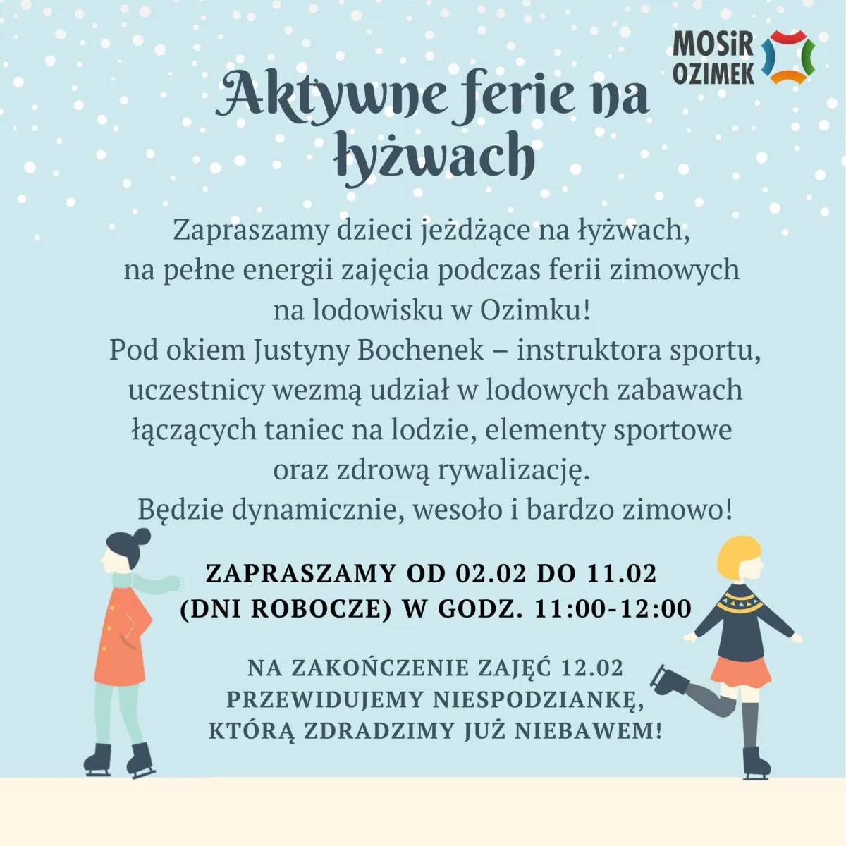 02.02-11.02 (dni robocze)godz. 11:00-12:00Lodowisko w Ozimku