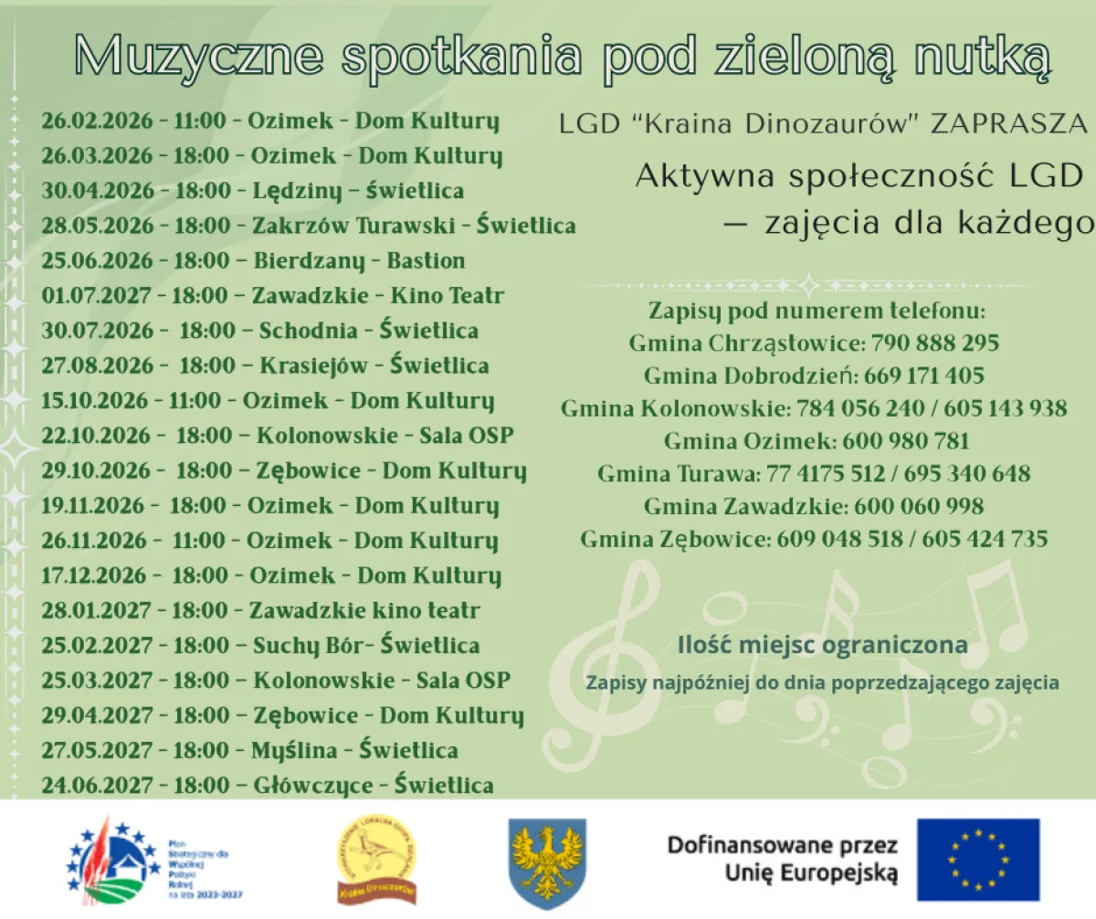 Lokalna Grupa Działania "Kraina Dinozaurów" zaprasza na Muzyczne spotkania pod zieloną nutką.