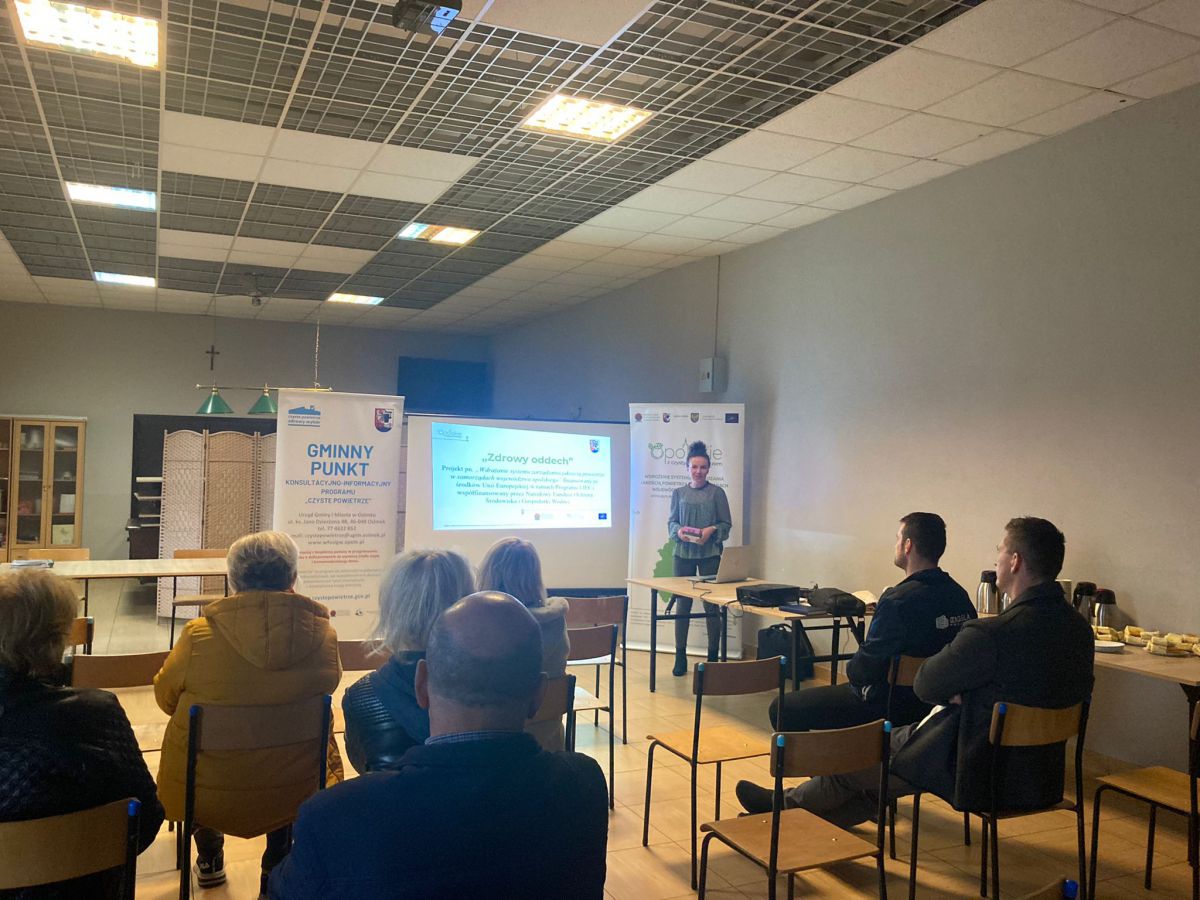 W pierwszym tygodniu kwietnia spotkaliśmy się z mieszkańcami Antoniowa i Jedlic. 7 kwietnia br. w Świetlicy wiejskiej w Antoniowie rozmawialiśmy o wpływie zanieszczenień powietrza na nasze zdrowie oraz możliwościach dofinansowań do wymiany pieca. O dofinansowaniu z Budżetu Gminy Ozimek opowiedział Gminny Koordynator Programu Ochrony Powietrza, natomiast o możlwości pozyskania dofinansowania z programu "Czyste powietrze" mówił Kierownik zespołu doradztwa energetycznego Wojewódzkiego Funduszu Ochrony Środowiska i Gospodarki Wodnej w Opolu Pan Dariusz Grabowiecki.