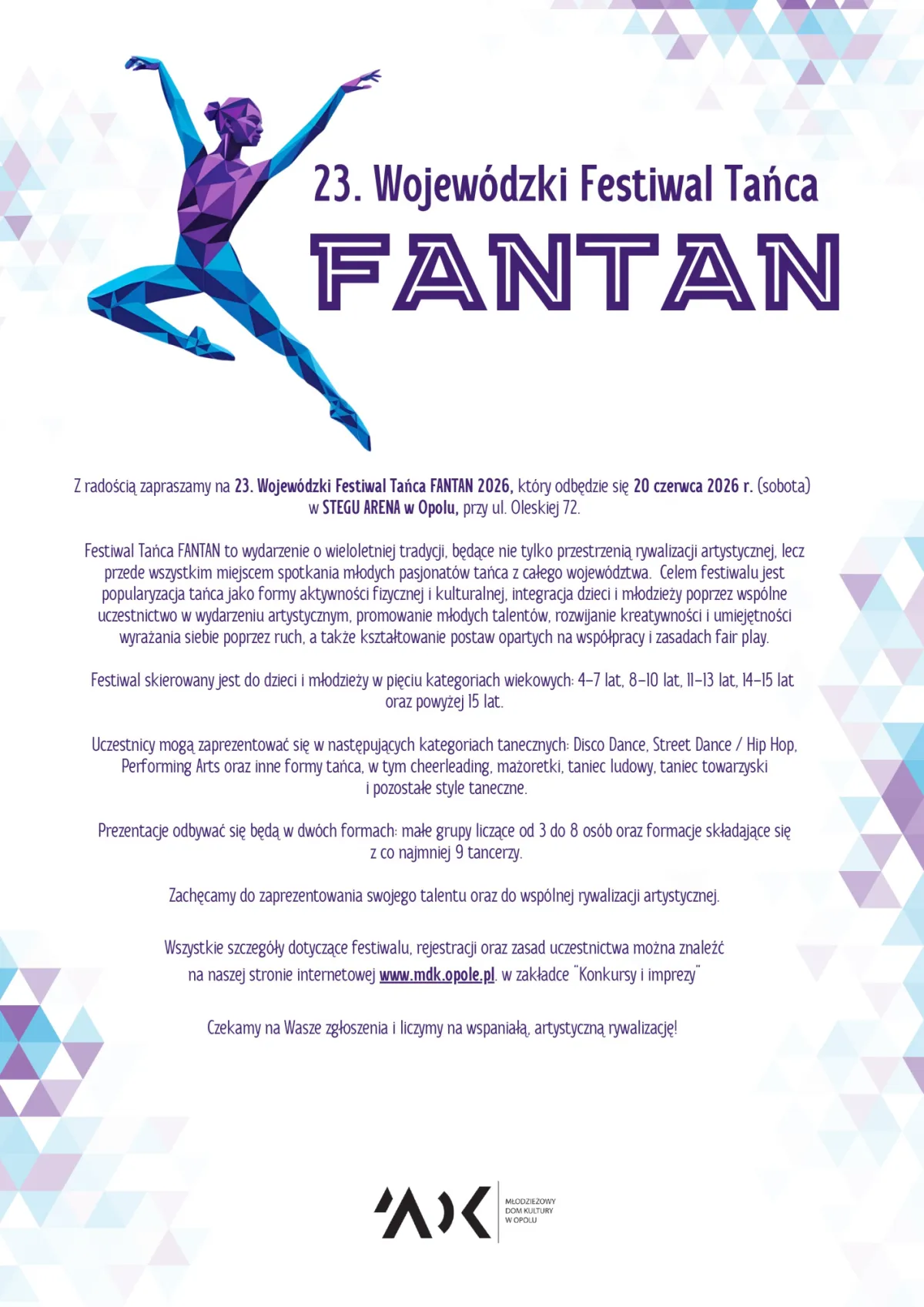 Młodzieżowy Dom Kultury w Opolu zaprasza do udziału w 23. Wojewódzkim Festiwalu Tańca FANTAN 2026, który odbędzie się 20 czerwca 2026 r. w Stegu Arena w Opolu.