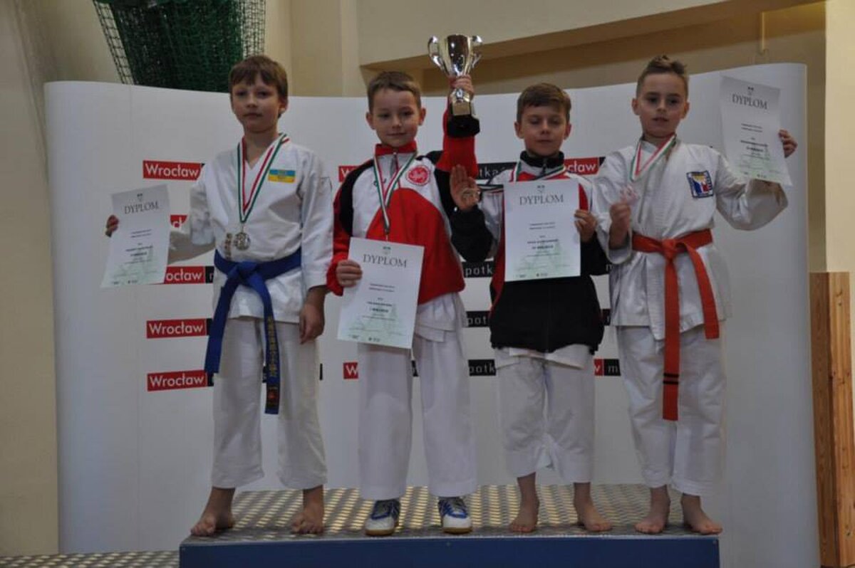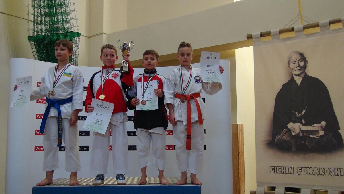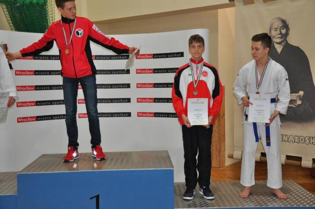 Przy okazji Seminarium od kilku już lat organizator, czyli AZS Wrocław organizuje w tym samym czasie turniej „Funakoshi CUP”. W tym roku do rywalizacji przystąpiło około 400 zawodników z Litwy, Ukrainy, Czech i Polski. Naszą sekcję na zawodach reprezentowali: Natalia Szponder, Mateusz Łapot, oraz bracia Michał i Rafał Talagowie. Jak można było się domyślać nasi karatecy nie wrócili z pustymi rękami. Natalia wystartowała w konkurencji kumite seniorek gdzie nie tracąc ani jednego punktu stanęła na najwyższym stopniu podium. Świetny występ zaliczył również Mateusz, który w kumite chłopców -63 zdobył brąz. Starszy z braci Rafał również startował w kumite, lecz ze względu na małą ilość zawodników w tej kategorii organizator postanowił połączyć konkurencje. I tak po 4 walkach 3 wygranych i 1 przegranej Rafał wywalczył najniższy stopień podium. Natomiast młodszy z braci Michał jak już zdążył nas przyzwyczaić nie miał sobie równych zarówno w kata jak i kumite zgarniając w obu konkurencjach krążki z najcenniejszego kruszcu. Zawodnicy mogą uznać ten turniej do bardzo udanych a wyniki potwierdzają wysoką formę na początku sezonu startowego. Gratulujemy