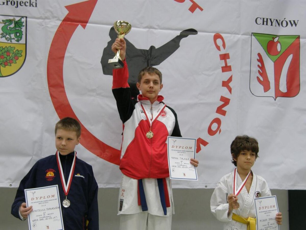 Jakiś czas temu wspominaliśmy o coraz lepszych osiągnięciach wychowanka naszej sekcji Karate Shotokan Rafała Talagi. Otóż bardzo miło nam poinformować że jego młodszy brat 7-mio letni Michał postanowił nie być gorszym i po roku od rozpoczęcia przygody z karate w ślad za Rafałem przywozi krążki z pierwszych ogólnopolskich zawodów. W dodatku aby troszkę nacisnąć bratu a odcisk zaczął kolekcjonować je od tych najcenniejszych czyli złotych. Michał w kwietniu wystartował na turniejach w Ścinawie VIII Otwarty Puchar Karate Goju-Ryu „Odra Cup” gdzie wystartował w dwóch konkurencjach i w obu zdobył złote medale ,do których Rafał dołożył swoje dwa złota. Tydzień później chłopaki na Ogólnopolskim Turnieju Karate „GROT CUP 2013”w Chynowie nie pozostawili złudzeń reszcie startujących wywożąc również po dwa złote krążki. Widać że rywalizacja na tytuły mistrzowskie działa motywująco na braci. Życzymy kolejnych sukcesów.