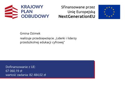 Przedszkole Publiczne Nr 1 w Ozimku działające na terenie Gminy Ozimek otrzymało grant na zakup cyfrowych materiałów dydaktycznych w ramach przedsięwzięcia „Liderki i liderzy przedszkolnej edukacji cyfrowej” finansowanego ze środków ... [ więcej ]