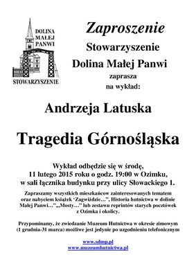 Stowarzyszenie Dolina Małej Panwi zaprasza na wykład Andrzeja Latuska zatykułowany "Tragedia Górnośląska", który odbędzie się 11.02 (środa) o godzinie 19:00, w sali PGKiM przy ulicy Słowackiego 1. Szczegóły na plakacie. ... [ więcej ]