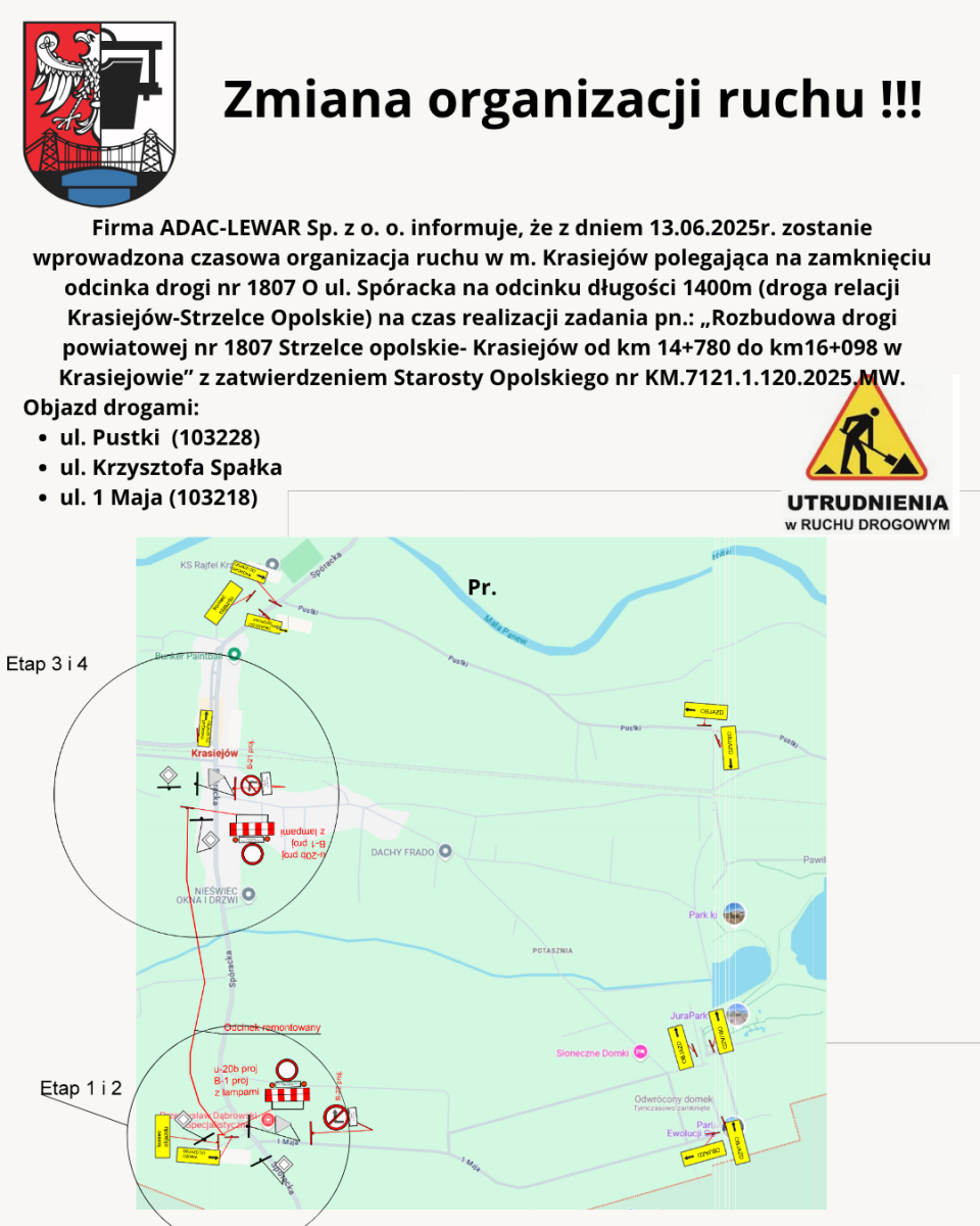 Firma ADAC-LEWAR Sp. z o. o. informuje, że z dniem 13.06.2025r. zostanie wprowadzona czasowa organizacja ruchu w m. Krasiejów polegająca na zamknięciu odcinka drogi nr 1807 O ul. Spóracka na odcinku długości 1400m (droga relacji Krasiejów-Strzelce Opolskie) na czas realizacji zadania pn.: „Rozbudowa drogi powiatowej nr 1807 Strzelce opolskie- Krasiejów od km 14+780 do km16+098 w Krasiejowie” z zatwierdzeniem Starosty Opolskiego nr KM.7121.1.120.2025.MW.